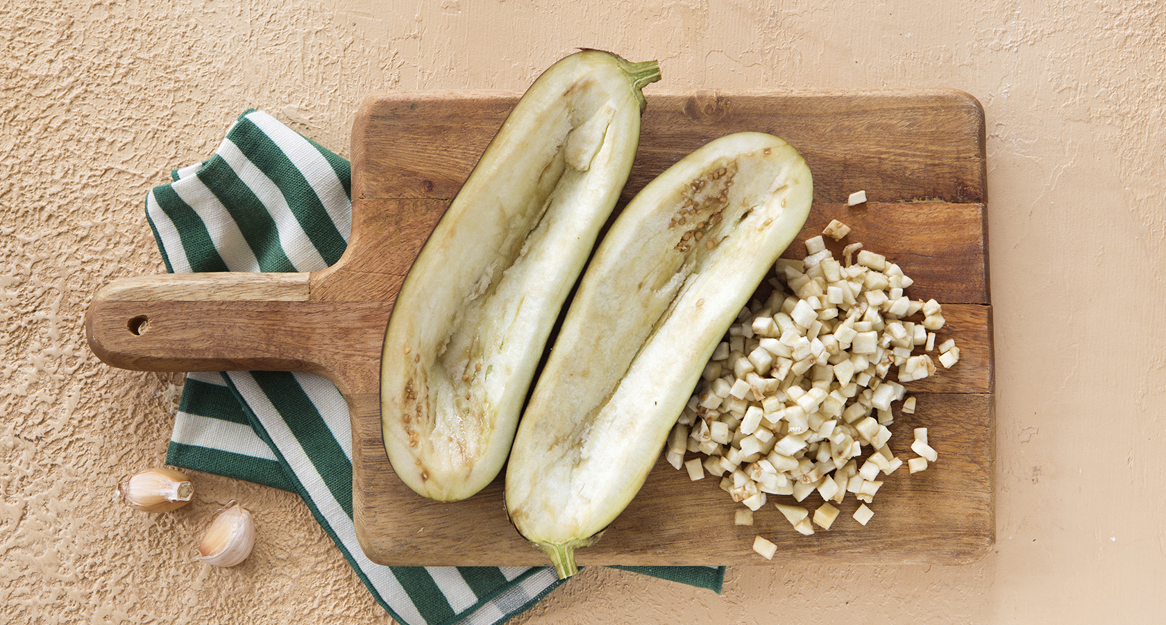 Шаг 1 Разрежьте баклажаны вдоль на половинки. Маленьким острым ножом вырежьте мякоть, оставив стенки толщиной 1 см. Подготовленные «лодочки» посолите, мякоть нарежьте маленькими кубиками.