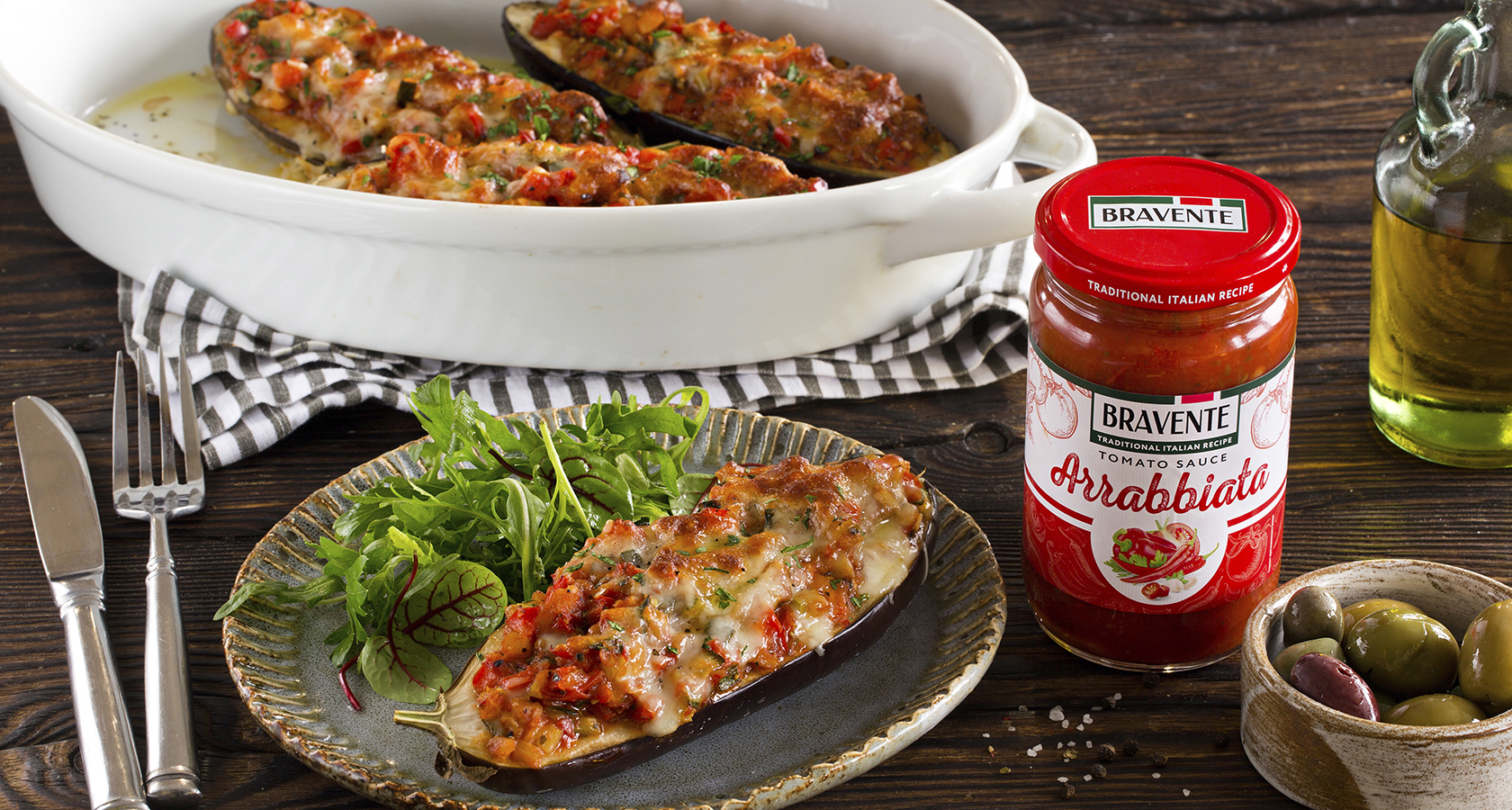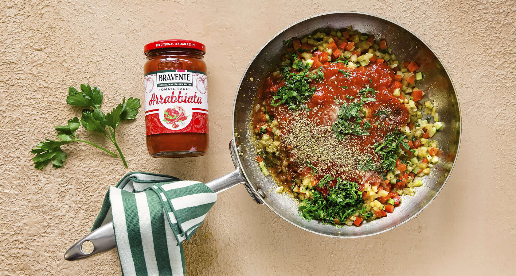 2 крупных баклажана 1 луковица 1 зубчик чеснока 1 маленький цукини 1 красный сладкий перец 2–3 веточки петрушки 100 мл соуса Arrabbiata Bravente ½ ч. л. смеси итальянских трав 100 г моцареллы 2 ст. л. оливкового масла соль