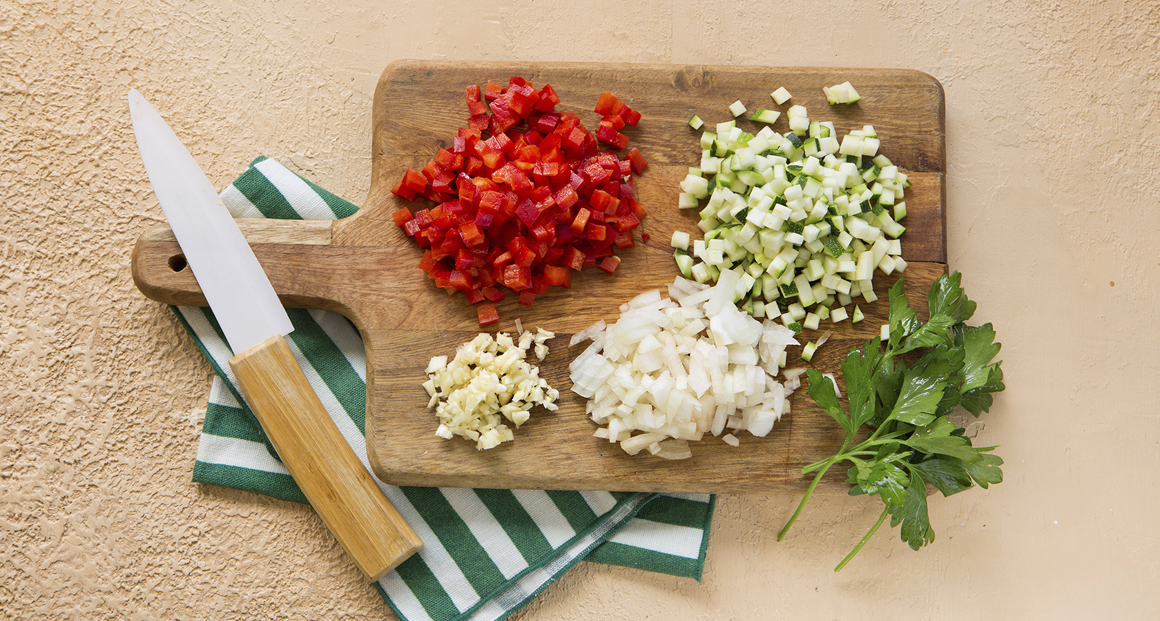 Шаг 2 Очистите лук и чеснок, измельчите. У перца удалите плодоножку и семена, нарежьте мелкими кубиками. Цукини тоже нарежьте маленькими кубиками. Петрушку измельчите.