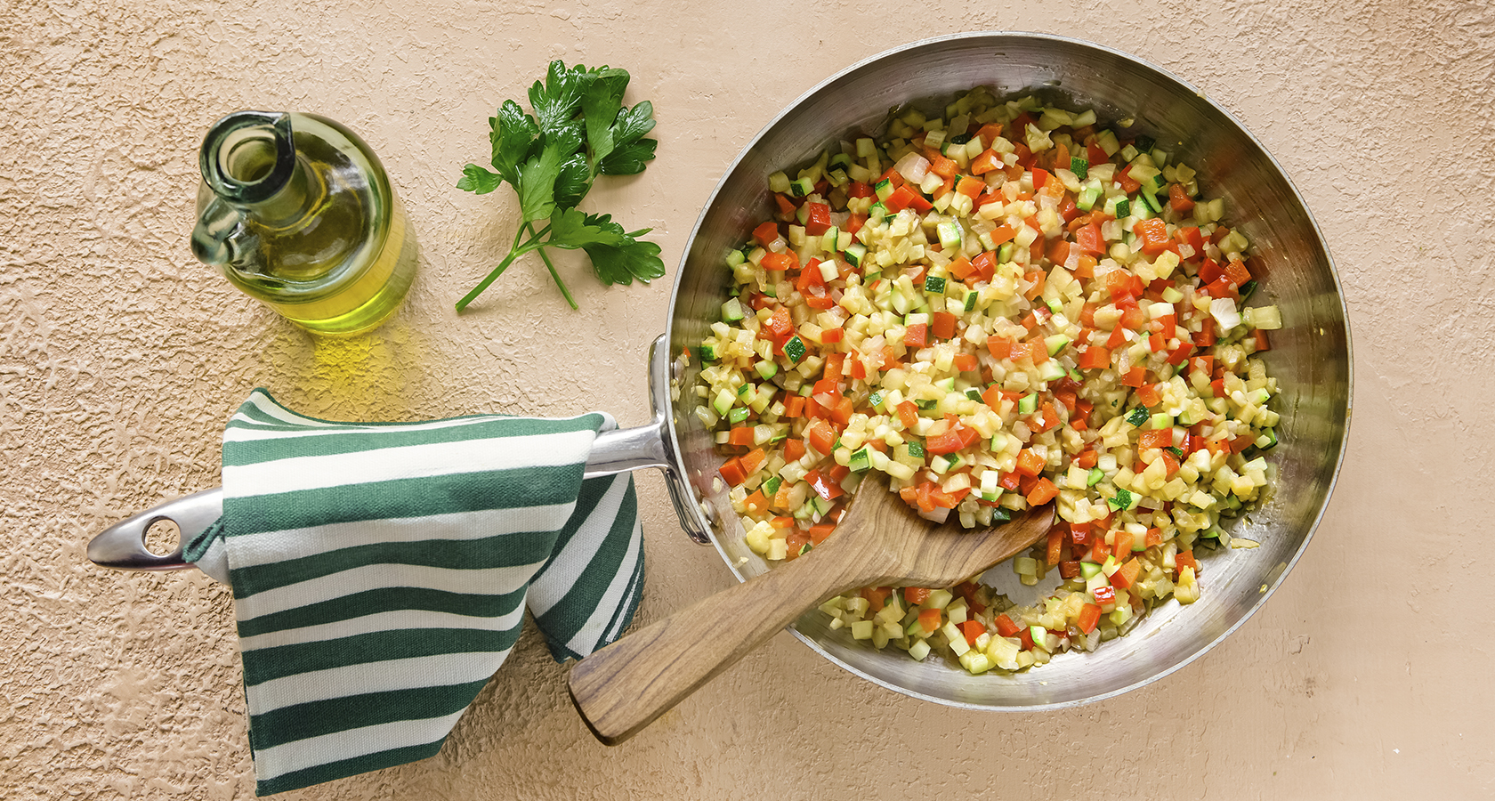 Шаг 3 Разогрейте духовку до 190 °С. В широкой сковороде разогрейте оливковое масло, выложите кубики баклажана, цукини, перца, лук и чеснок, готовьте, помешивая, 10 мин.